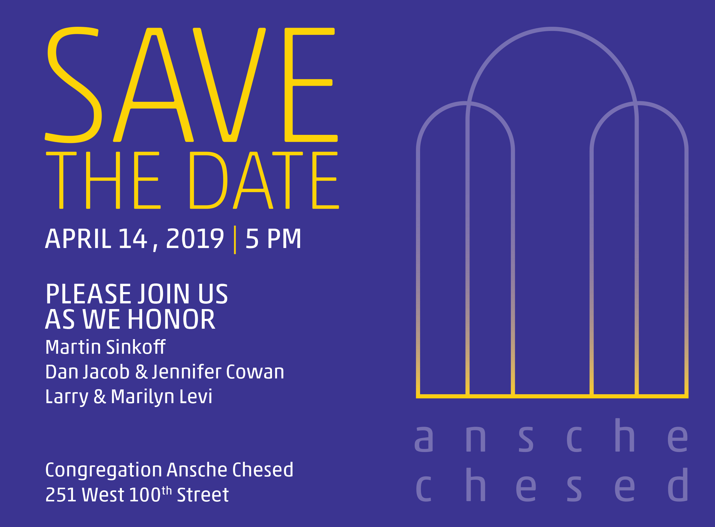 Please join us every year for our annual Ansche Chesed Tribute gala as we honor members who have shown dedicated and extraordinary service. Join us for dinner and cocktails, engaging tributes, and entertainment!