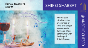 Join Hazzan Hirschhorn for an evening of song and prayer as we support and elevate the voice of our community with the help of Shirei Chesed singers.