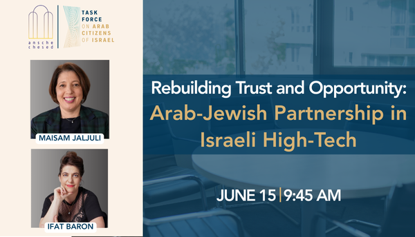 Please join Ansche Chesed and The Task Force on Arab Citizens of Israel for a conversation with Maisam Jaljuli, CEO of Tsofen-Tashbik, and Ifat Baron, founder and CEO of itworks— leaders advancing inclusive employment in Israel’s high-tech sector. Their work to sustain high-tech as a space for Arab economic mobility and Jewish-Arab partnership in Israel is both more challenging and important under the strains of a polarized and war-strained society. As government and international funding declines and public discourse grows increasingly polarized, what role can civil society play in rebuilding trust and ensuring inclusive growth in this sector and Israel as a whole?