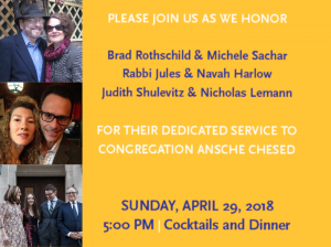 Join us as we honor Brad Rothschild and Michele Sachar Rabbi Jules and Navah Harlow Judith Shulevitz and Nicholas Lemann For their dedicated service to Congregation Ansche Chesed Register on our Tribute Website.